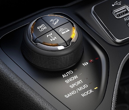 TACKLE THE TOUGHEST TERRAINThe Jeep® Selec-Terrain® Traction Management System gives you the power and capability to handle almost anything Mother Nature sends your way. Five efficient Modes: Auto, Sport, Snow, Sand/Mud and available Rock, are engineered to deliver the ultimate driving stability by coordinating 12 vehicle systems. |   |