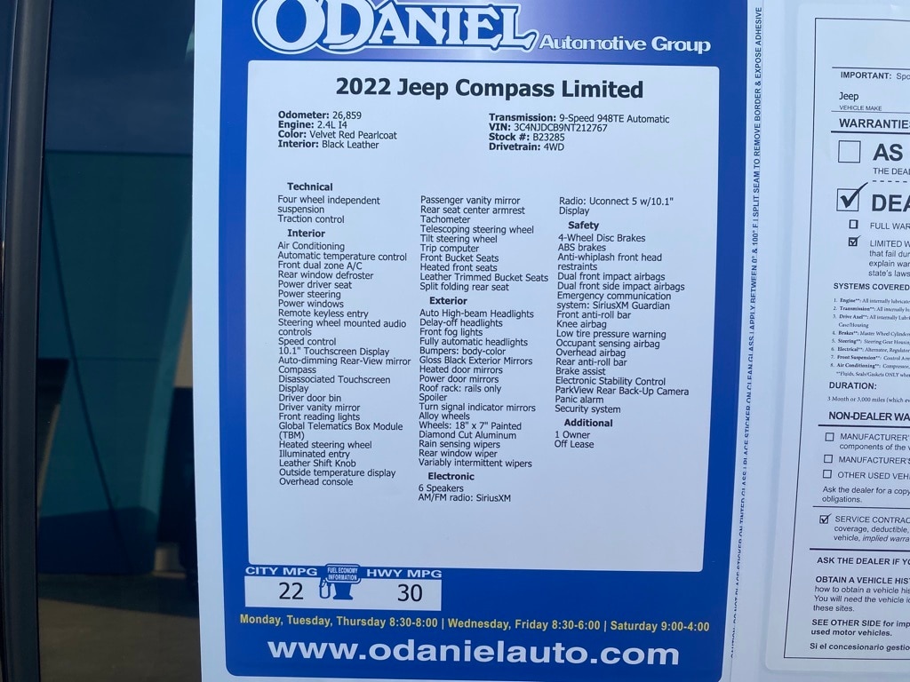 1 Owner, Off Lease, Compass Limited, 4WD, Auto High-beam Headlights, Heated front seats, Leather Trimmed Bucket Seats, ParkView Rear Back-Up Camera, Power driver seat, Quick Order Package 2GG, Rain sensing wipers, Wheels: 18" x 7" Painted Diamond Cut Aluminum.