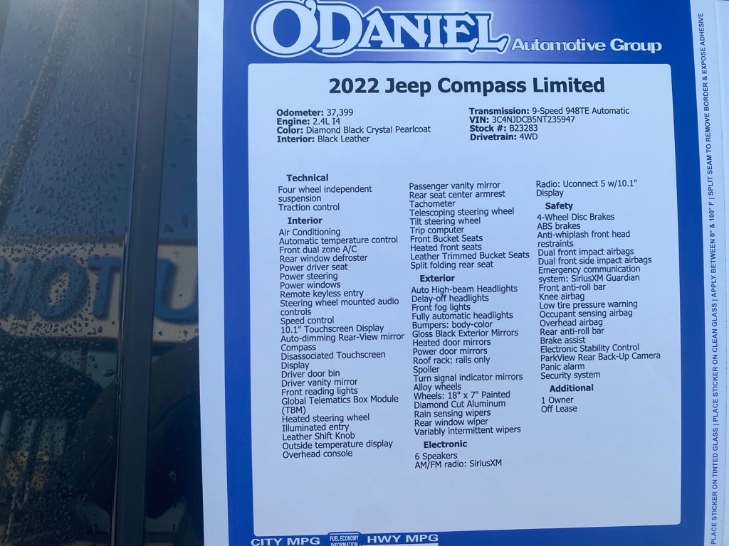 1 Owner, Off Lease, Compass Limited, 4WD, Auto High-beam Headlights, Heated front seats, Leather Trimmed Bucket Seats, ParkView Rear Back-Up Camera, Power driver seat, Quick Order Package 2GG, Rain sensing wipers, Wheels: 18" x 7" Painted Diamond Cut Aluminum.