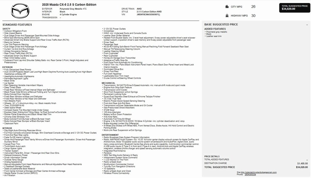 1 Owner, Certified Pre-Owned, CX-5 2.5 S Carbon Edition, AWD, AppLink/Apple CarPlay and Android Auto, Exterior Parking Camera Rear, Heated front seats, Leather Seat Trim, Memory seat, Power driver seat, Power Liftgate, Power moonroof, Rain sensing wipers, Wheels: 19" x 7J Aluminum Alloy.