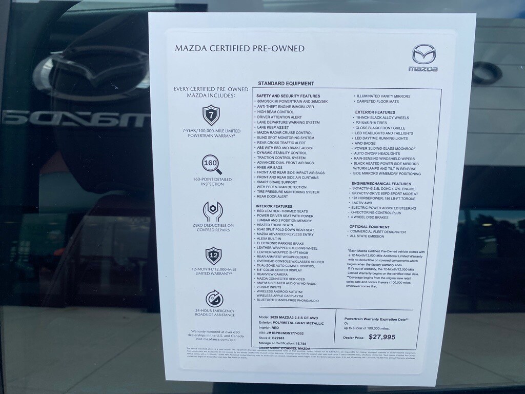 Certification Program Details: Only the Best-Maintained late-model vehicles make the Mazda Certified Pre-Owned (CPO) make the cut. To be eligible, vehicle must pass a 160 point rigorous inspection from major to minor components each vehicle is scrutinized and tested. Mazda CPO'S will also include: *12 month/12,000 miles CPO limited warranty * 7year/100,000 mile limited powertrain warranty * Zero Deductible on covered repairs * 24 hour emergency road side assistance * 3-month complimentary Sirius XM radio Trial