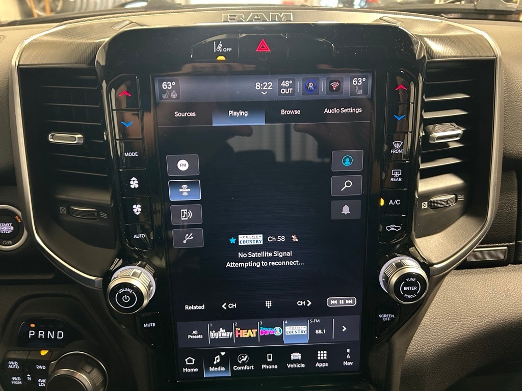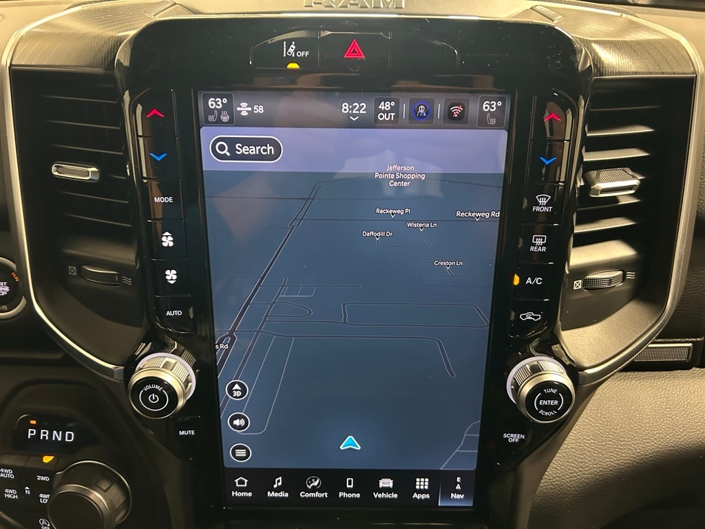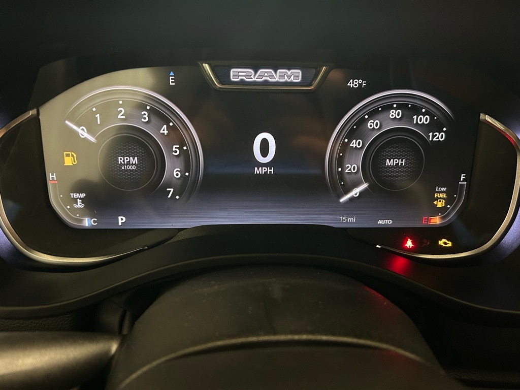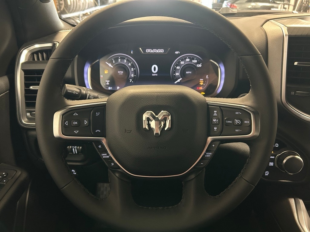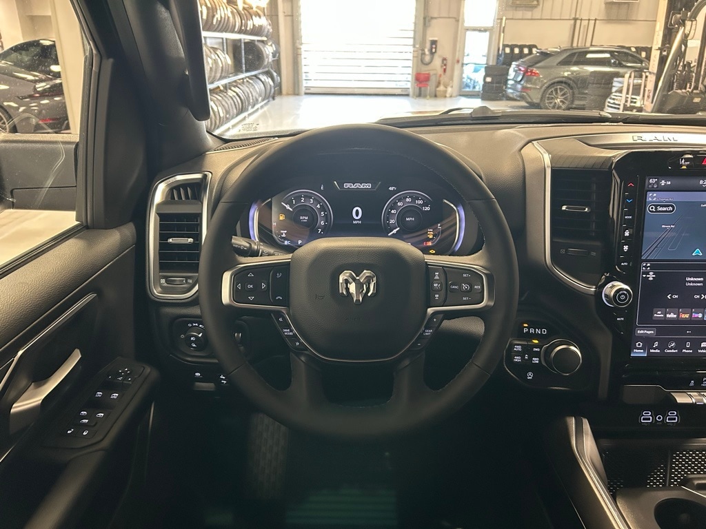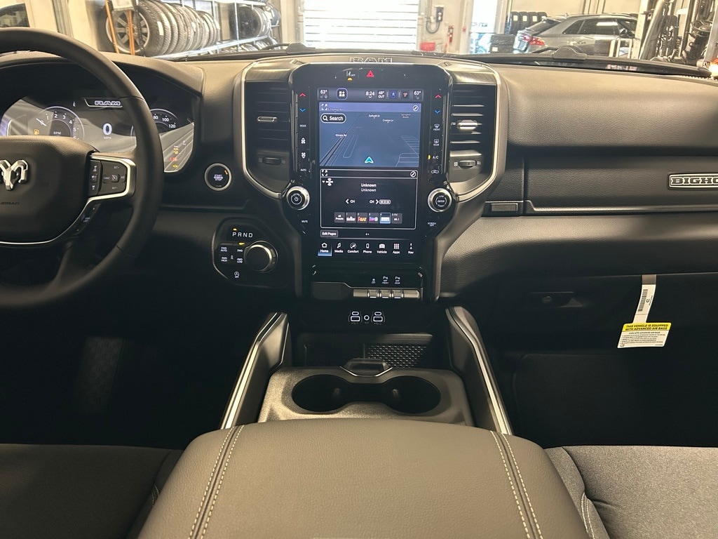115V Auxiliary Power Outlet, 115V Auxiliary Rear Power Outlet, 12" Touchscreen Display, 2nd Row In Floor Storage Bins, 3 Rear Seat Head Restraints, 3.55 Rear Axle Ratio, 4 Way Front Headrests, 400W Inverter, 4G LTE Wi-Fi Hot Spot, 9 Amplified Speakers w/Subwoofer, Accent Color Door Handles, Accent Color Premium Power Mirrors, Accent Color Tailgate Handle, Air Conditioning ATC w/Dual Zone Control, Anti-Spin Differential Rear Axle, Apple CarPlay, Auto Power-Folding Mirrors, Auto-Dimming Exterior Driver Mirror, Auto-Dimming Rear-View Mirror, Big Horn Badge, Big Horn Level 2 Equipment Group, Black Exterior Mirrors, Black Exterior Truck Badging, Black Headlamp Bezels, Black Interior Accents, Black Painted Exterior Mirrors Caps, Black Premium Power Mirrors, Black Tail Lamp Bezels, Body Color Front Bumper, Body Color Rear Bumper w/Step Pads, Bucket Seats, Cluster 7.0" TFT Color Display, Configurable Drive Mode, Connected Travel & Traffic Services, Connectivity - US/Canada, Convex Wide-Angle Exterior Mirror Insert, Deluxe Cloth Bucket Seats, Exterior Mirrors Courtesy Lamps, Exterior Mirrors w/Heating Element, Exterior Mirrors w/Supplemental Signals, Front Seat Back Map Pockets, Full Length Floor Console, Glove Box Lamp, Google Android Auto, GPS Antenna Input, GPS Navigation, Grille Black Surround Black Mesh, HD Radio, Heated Front Seats, Heated Steering Wheel, Integrated Voice Command w/Bluetooth, Leather Wrapped Steering Wheel, LED Dome Lamp w/On/Off Switch, LED Footwell Lighting, Manual Adjust 4-Way Front Passenger Seat, Media Hub w/2 Charge Only USBs, Night Edition, Overhead LED Lamps, Power 2-Way Driver Lumbar Adjust, Power Adjust 8-Way Driver Seat, Power Adjustable Pedals, Premium Overhead Console, Quick Order Package 23Z Big Horn, Radio: Uconnect 5 Nav w/12.0" Display, RAM Grille Badge - Black, Rear 60/40 Folding Seat, Rear Center Armrest, Rear Power Sliding Window, Rear Window Defroster, Remote Tailgate Release, Security Alarm, SiriusXM w/360L, Steering Wheel Mounted Audio Controls, Sun Visors w/Illuminated Vanity Mirrors, Universal Garage Door Opener, USB Host Flip, Wheels: 20" x 9.0" Aluminum Painted Clad.