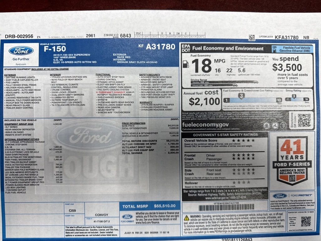 Extra Clean!, Local Trade, F-150 XLT, 4D SuperCrew, 5.0L V8, 10-Speed Automatic, 4WD, Race Red, Dark Earth Gray w/Cloth 40/Console/40 Front-Seats or Cloth 40/Console/40 Front-Seats, 10-Way Power Driver & Passenger Seats, 2-Bar Style Grille w/Chrome 2 Minor Bars, 4.2" Productivity Screen in Instrument Cluster, Auto-Dimming Rear-View Mirror, Chrome Door & Tailgate Handles w/Body-Color Bezel, Chrome Step Bars, Class IV Trailer Hitch Receiver, Cloth 40/20/40 Front Seat, Equipment Group 302A Luxury, Fixed Backlight w/Privacy Glass, Heated Front Seats, Leather-Wrapped Steering Wheel, LED Box Lighting, Power Glass Heated Sideview Mirrors, Power-Adjustable Pedals, Power-Sliding Rear Window, Pro Trailer Backup Assist, Rear Under-Seat Storage, Rear Window Defroster, Remote Start System, Single-Tip Chrome Exhaust, SiriusXM Radio, Trailer Tow Package, Twin Panel Moonroof, Upgraded Front Stabilizer Bar, Wheels: 18" Chrome-Like PVD, XLT Chrome Appearance Package, XLT Power Equipment Group.