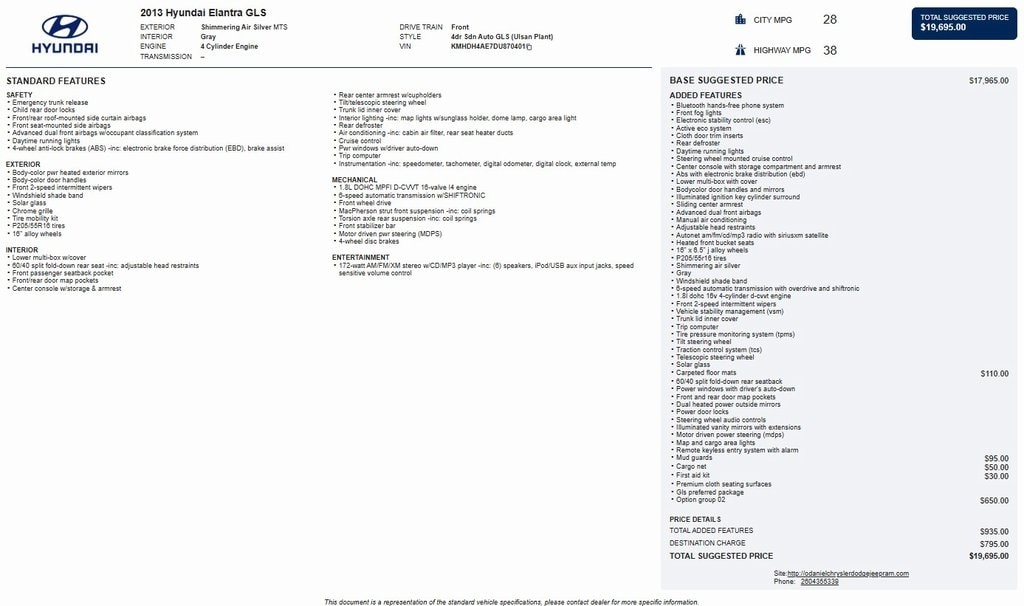 Local Trade in, Elantra GLS, 6-Speed Automatic with Overdrive, 60/40 Split Fold-Down Rear Seatback, ABS w/Electronic Brake Force Distribution (EBD), Active ECO System, Adjustable Head Restraints, Advanced Dual Front Airbags, Alloy wheels, Bluetooth® Hands-Free Phone System, Bodycolor Door Handles & Mirrors, Center Console w/Storage Compartment & Armrest, Cloth Door Trim Inserts, Daytime Running Lights, Dual Heated Power Outside Mirrors, Electronic Stability Control, Front & Rear Door Map Pockets, Front 2-Speed Intermittent Wipers, Front Fog Lights, GLS Preferred Package, Heated Front Bucket Seats, Illuminated Ignition Key Cylinder Surround, Illuminated Vanity Mirrors w/Extensions, Lower Multi-Box w/Cover, Manual Air Conditioning, Map & Cargo Area Lights, Motor Driven Power Steering (MDPS), Option Group 02, Power Door Locks, Power Windows w/Driver's Auto-Down, Rear Defroster, Remote Keyless Entry System w/Alarm, Sliding Center Armrest, Solar Glass, Steering Wheel Audio Controls, Steering Wheel Mounted Cruise Control, Telescopic Steering Wheel, Tilt Steering Wheel, Tire Pressure Monitoring System, Traction Control System, Trip Computer, Trunk Lid Inner Cover, Vehicle Stability Management, Windshield Shade Band.