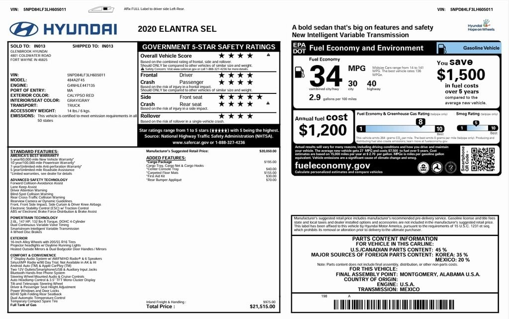 Elantra SEL, Alloy wheels, Apple CarPlay & Android Auto, Cargo Net, Cargo Package (C1), Exterior Parking Camera Rear, Option Group 01, Reversible Cargo Tray, Trunk Hooks.