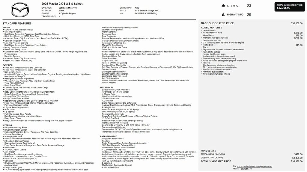 1 Owner / Local Trade in, Certified Pre Owned, CX-5 2.5 S Select Package, AWD, Alloy wheels, AppLink/Apple CarPlay and Android Auto, Auto High-beam Headlights, Exterior Parking Camera Rear, Heated front seats, Leatherette Seat Trim, Power driver seat, Rain sensing wipers.