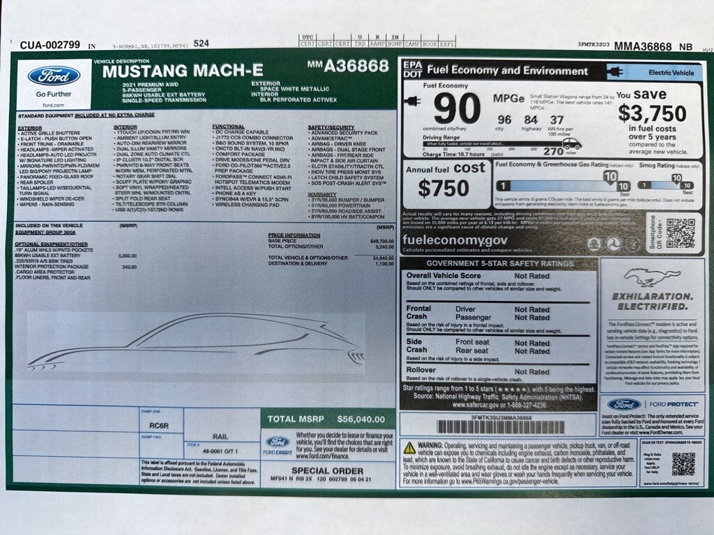 Extra Clean!, Local Trade, Mustang Mach-E Premium, 4D Sport Utility, Dual Electric Motor, Single-Speed Automatic, AWD, White Metallic, Black Onyx Premium Synthetic, Cargo Area Protector, Equipment Group 300A, Front & Rear Floor Liners, Interior Protection Package (Pre-Installed), Navigation system: Connected Navigation.