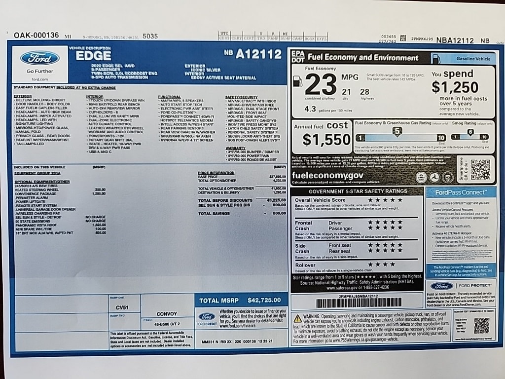 2022 Ford Edge SEL Iconic Silver Metallic AWD EcoBoost 2.0L I4 GTDi DOHC Turbocharged VCT