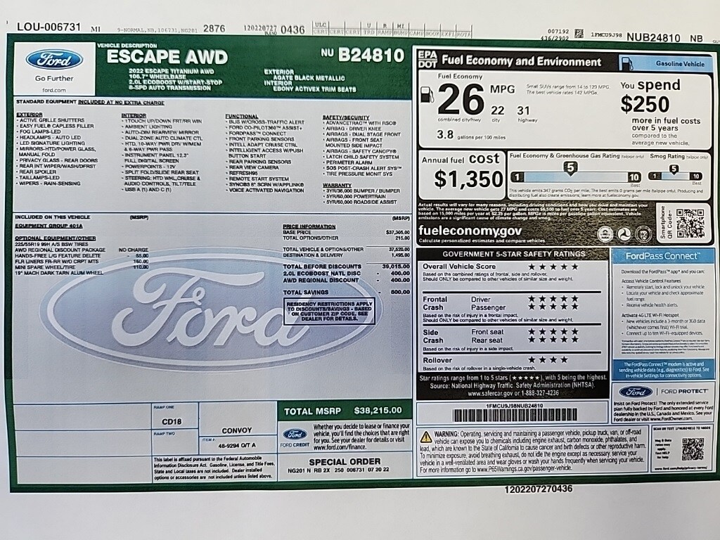 2022 Ford Escape Titanium Agate Black Metallic AWD EcoBoost 2.0L I4 GTDi DOHC Turbocharged VCT