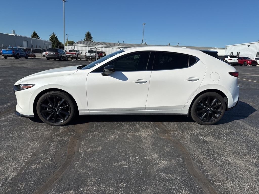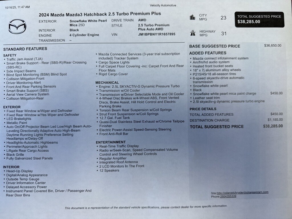 Mazda3 2.5 Turbo Premium Plus Package, 4D Hatchback, 2.5L I4, 6-Speed Automatic, AWD, Snowflake White Pearl Mica, Black Leather.